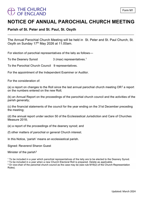 A copy will still be sent by email to those who request it, this can be done by emailing Emma at info@stosythparishchurch.co.uk and a paper copy will still be available to those who prefer at the back of Church. A large print version is also available upon request.